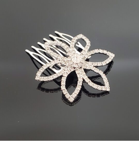 - The CO0204 6-Petal Flower Rhinestone Hair Comb features a gorgeous flower-shaped design, measuring 2″ x 2.5″. Each comb boasts six symmetrical petals adorned with clear mini rhinestones, and a larger, vibrant center rhinestone that adds a touch of brilliance.