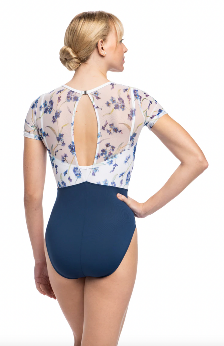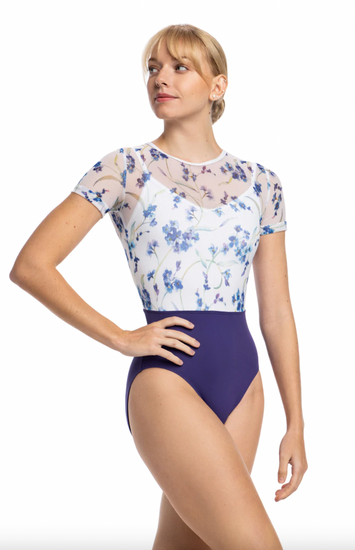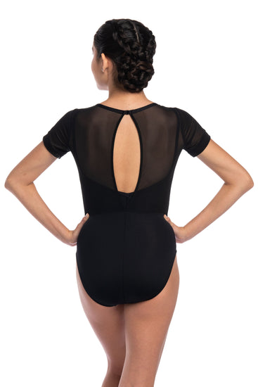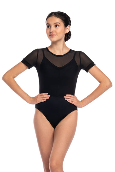 Adina Short Sleeve Leotard 1116FM and 1116ME from Ainsliewear is a beautiful leotard. This bodysuit is a fresh option for those seeking a sleeve. This two-layered design has a classic spaghetti strap as a base and a built-in mesh layer worn over the top. The mesh top clasps together at the back. This modern leotard features the new high cut leg line.
