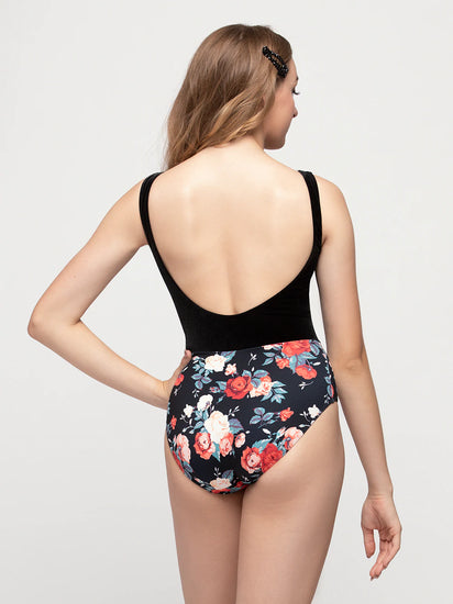 Allison Bed of Roses Tank Leotard from Eleve Dancewear is a superior fashion leotard. Flourish in the sophisticated Allison silhouette adorned with our Bed of Roses print. The high boat neck front showcases the beauty of the festive floral arrangements, and the luxurious black velvet low back provides texture and a hint of sheen.