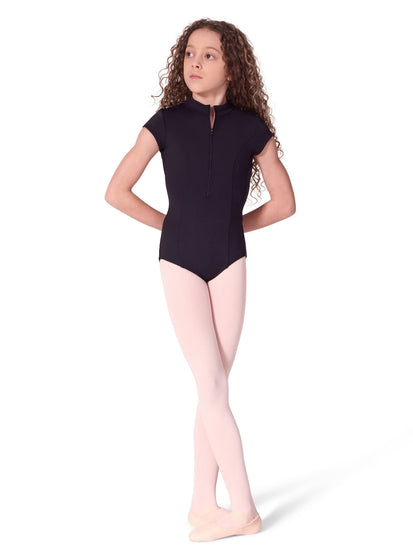 Soft Elegance Short Sleeve Princess Leotard EL107T by Capezio is a chic blend of elegance and fun. Designed with a sleek mock neck, short sleeves, and a zipper front for easy wear, it combines comfort with style. Princess seams and lace panels add a feminine touch, while a back cut-out brings a playful twist. Finished with a ballet leg line, this leotard offers freedom of movement for class or performance.