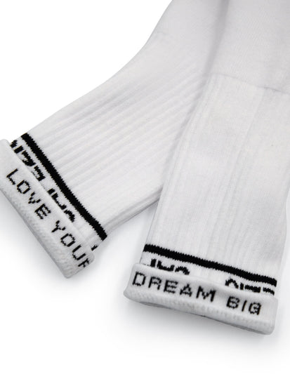 - Inside of sock says "LOVE YOURSELF" and "DREAM BIG"