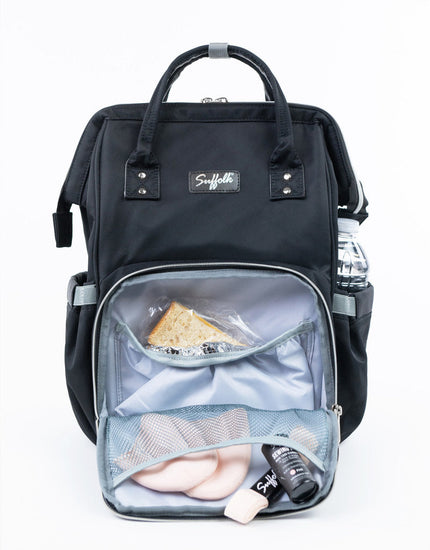 Company Bag 1588 from Suffolk is a superior dance bag. This bag has handles and backpack straps. On the outside of the bag, the front features a large, zippered compartment that contains an insulated snack pocket; while the back features a zippered cell phone pocket; and a rear zipper that has access to the main compartment. Inside the bag, there are 6 individual compartments perfect for dance shoes. Inside there are also two zippered compartments, one with water-proof lining. The bag is 16 inches tall, 10 inches wide, and 9 inches deep.