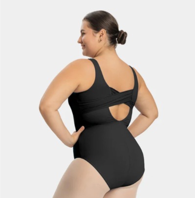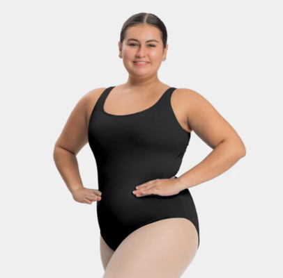 This leo is made from soft, body-hugging microfiber that has an "oh' so comfortable" fit and feel. Featuring a modest scoop neck with large gathered straps that start at the side seam, this tank is a studio classic. You’ll have coverage and control from every angle.