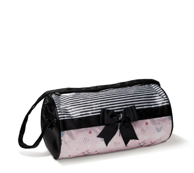 Style B22501 from Danshuz is a printed satin roll bag with black and white striping and a contrasting pink "Ballerina Dreams" print. Trimmed with black ribbon and bow with an embroidered "d" logo. Dance bag is also equipped with a zipper pocket at inside lining. Bag is fully lined, lightweight and folds flat.