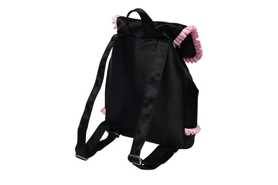 Ballet Ruffle Duffel B23500 from Danshuz is an adorable dance backpack. This backpack is trimmed with pink ruffles on a black quilted front. Sequin ballet shoes adorn the front flap and additional features include a magnetic snap plus drawstrings to prevent contents from spilling out. Also includes a carrying handle with adjustable shoulder straps. The inside compartment is fully lined, this bag wipes clean and folds flat.