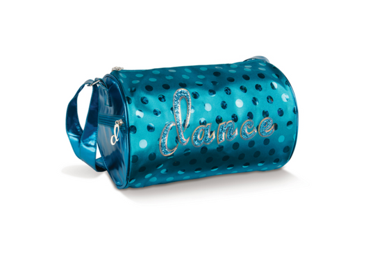 Dance Dot Duffle B20517 from Danshuz is a beautiful dance bag. Glittery fun dot duffel in pink and turquoise adorned with the word "dance". Includes exterior side zipper pocket and adjustable shoulder or carrying strap. Fully lined inside compartment with zipper pocket and water repellent outer shell that is easy to wipe clean. Lightweight and folds flat.