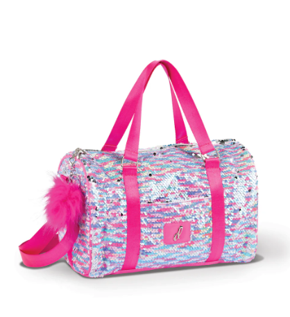 Style B24507 from Danshuz has Blue & Pink sequins contrast with bright trim bring this Glamour Glitz sequin duffle alive! Featuring a front outside pocket plus inside zipper pocket and fully lined interior. Bright colored soft handles and adjustable shoulder strap plus poof keychain makes this a winner for all ages. This bag wipes clean and folds flat.