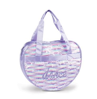 Style B24510 from Danshuz ia an adorable lavender shimmering sequined heart tote, the sweetest dance bag for any young dancer. The word dance is embroidered front and center. A full zipper top, double handles and 2 exterior pockets, front and back, complete this cute tote. This bag wipes clean and folds flat.