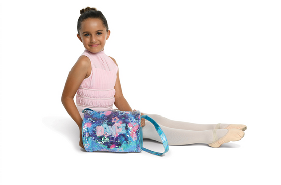 Stars Sequin Roll Bag B23514 from Danshuz will be on every kid’s wish list. This super cute sparkly sequin bag features a vibrant colorful sequin outer fabrication highlighted with stars and the word DANCE in glittery pink and blue letters. The two bag ends and adjustable carrying handle/shoulder strap are made from a holographic material, one side includes a zipper pocket. The inside compartment is fully lined, zips closed, wipes clean and folds flat.