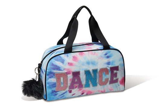 Swirl tie-dye effect printed duffel bag B25503 from Danshuz with glitter lettering appliques, spelling out the word "DANCE". Other features include a black pom-pom keychain, inside zipper pocket and an adjustable shoulder strap. Bag is fully lined, lightweight and folds flat.
