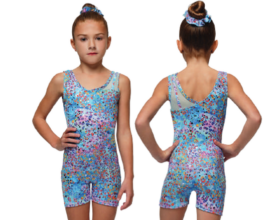 Gymnastics Biketard with Mesh Sleeve 17823 from Mondor is a stunning gymnastics biketard. This leo is a tank style that will keep you secure and the longer shorts give you more coverage. This fun print along with the matching scrunchie will make you stand out!