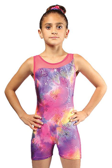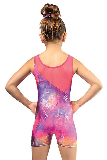 Biketard 27813 from Mondor is an exceptional gymnastics leotard. This biketard style that will keep you secure while you practice. The gymnastics biketard features a bold print, along with solid colour swirl and shimmering metallic accents that is eye catching. A comfortable sorbtek gusset and matching hair tie make this the perfect gymnastics bodysuit.