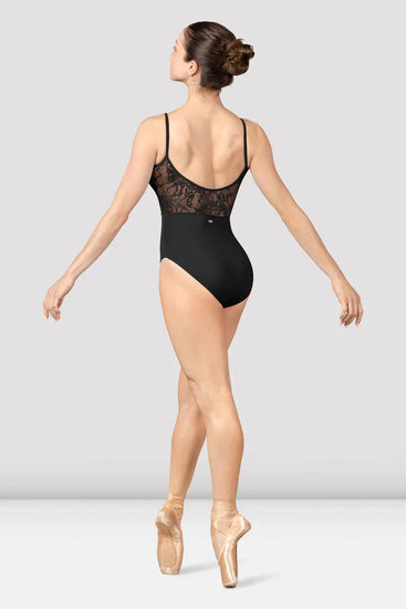 Camisole Leotard M2194LM from Mirella's Majesty Collection combines elegance and grace with its delicate lace bodice, dainty camisole straps, and striking lace scoop back. Featuring a flattering V-neck, lace details, and a ballet leg line, this leotard enhances your silhouette with timeless sophistication.