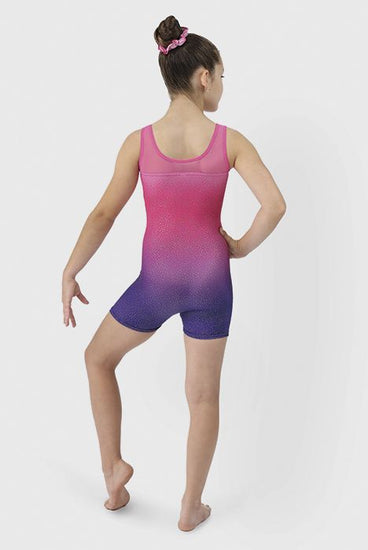 The Printed Unitard 17829 from Mondor showcases a striking gradient design, perfect for making a statement. This all-in-one piece is fully lined for comfort and features a gusset to allow for seamless movement. The sleeveless style ensures breathability, making it an excellent choice for dance, gymnastics, or any active performance. A matching hair tie is included to complete the look.