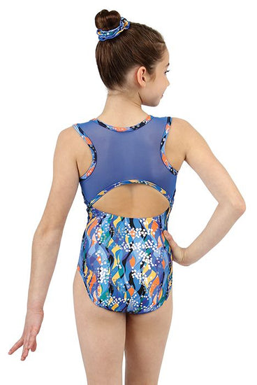 Printed Tank Leotard 17897 from Mondor is an exceptional gymnastics leotard. This leotard is a tank style that will keep you secure while you practice. The gymnastics leotard features a bold print, with beautiful back cut outs contrast highlighting shimmering metallic accents that is eye catching. A comfortable sorbtek gusset and matching hair tie make this the perfect gymnastics bodysuit.