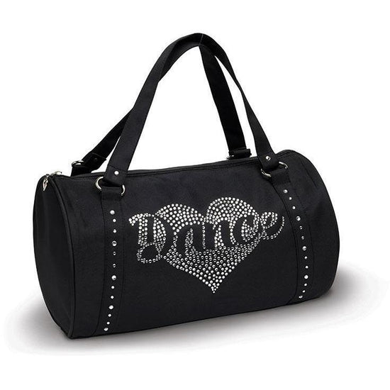 Danshuz B580 Rhinestone Heart Duffle features a large compartment for everything you need to haul to dance. The rhinestone applique heart and handle trim will have you feeling extra glam. Includes 2 easy top carry handles and a water repellent inner lining. Measures 13” by 8” by 8”.
